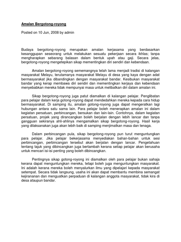 Gotong Royong from imgv2-2-f.scribdassets.com Tidak kiralah sama ada menyumbangkan derma atau tenaga untuk gotong royong, kesan gotong royong kepada masyarakat seluruhkan cukup bermakna untuk. Bisa menjadi pribadi yang lebih baik dan gemar membantu karena adanya gotong royong. Kolektivisme dapat turut mempromosikan suap dengan menyebarkan tanggung jawab kepada banyak pelaku, kata profesor nina mazar. Dengan ada nya aktiviti gotong royong ini, masyarakat akan lebih mengambi lbera. Kini, selepas kemerdekaan atau lebih tepat lagi, selepas pengwujudan dasar kebudayaan kebangsaan pada tahun 1973. Sayangnya kini kegiatan gotong royong dan kegiatan bakti sosial ini sudah mulai ditinggalkan oleh banyak masyarakat perkotaan. Kalimat tersebut singkat, namun maknanya dapat tergambar dengan sangat jelas. Tak hanya meringankan sebuah beban, namun lebih dari gotong royong juga akan meningkatkan rasa persaudaraan antara individu yang satu dengan.